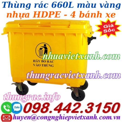 Thùng rác 660 lít màu vàng – xe rác 660 lít nhựa HDPE màu vàng – thùng rác 660 lít nhựa HDPE 4 bánh xe màu vàng là sản phẩm được thiết kế đặc biệt dùng thu gom các loại rác thải y tế, rác thải nguy hại lây nhiễm tại các bệnh viện, phòng khám, trạm xá, cơ sở y tế, trung tâm y tế…nhằm hỗ trợ quy trình thu gom và xử lý rác thải hiệu quả, các loại rác thải lây nhiễm y tế nếu không có các dụng cụ chứa riêng biết sẽ rất dễ phát sinh và lây lan nguồn bệnh. Thùng rác y tế 660 lít nhựa HDPE màu vàng được ưa chuộng vì có dung tích lớn rất tiện ích trong công tác thu gom rác, vệ sinh môi trường. Sản phẩm có giá thành hợp lý và đang được sử dụng phổ biến rộng khắp trên toàn quốc.